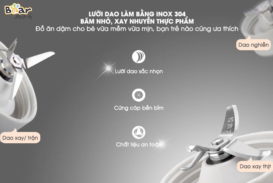 Máy xay 3 cối Bear nói riêng và tất cả các dòng đồ gia dụng Bear nói chung đều được sản xuất từ những nguyên liệu an toàn, có độ bền cao cùng khả năng vận hành êm ái.