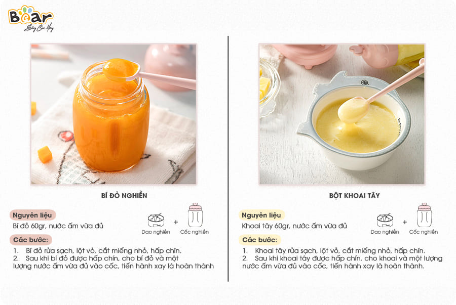 - Đối với giai đoạn phát triển trên 1 tuổi, bạn có thể cho bé được trải nghiệm nhiều món ăn dặm khác nhau như sinh tố, bánh ăn dặm, cháo dinh dưỡng mặn, cháo dinh dưỡng ngọt, các loại củ quả nghiền,… Thực đơn ăn dặm càng phong phú, các chất dinh dưỡng càng nhiều và cơ thể, trí óc của bé sẽ được phát triển toàn diện. Với máy xay 3 cối Bear, bạn hoàn toàn có thể tạo ra những bữa ăn đa dạng và chất lượng cho con của mình.