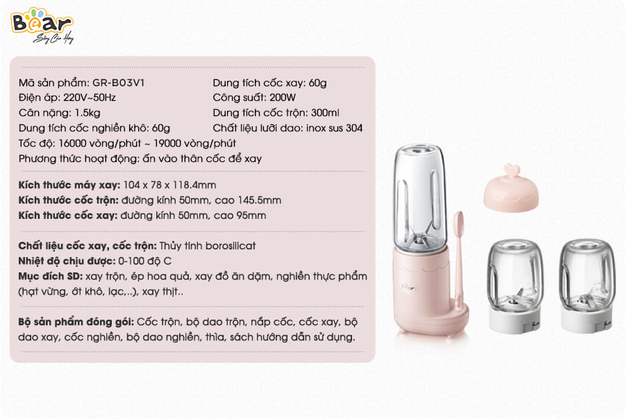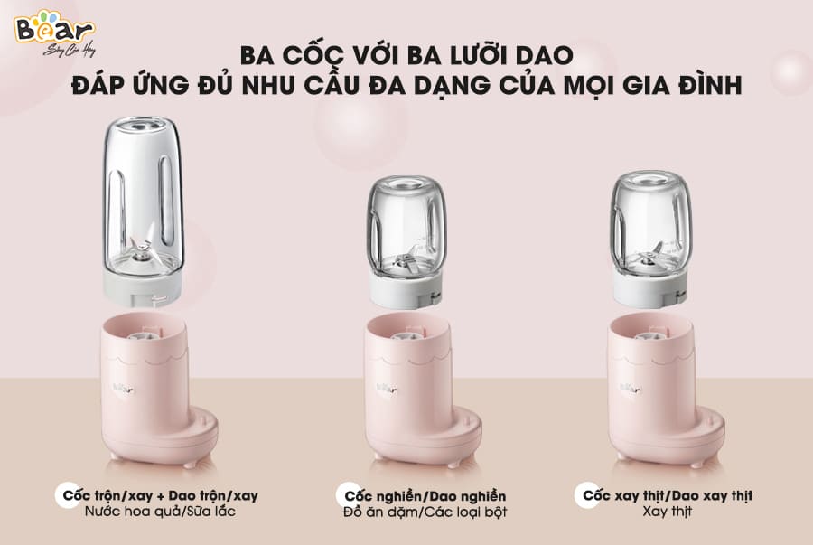 Máy xay 3 cối Bear LLJ-C04J1 (GR-B03V1) xứng đáng là máy xay ăn dặm đa năng nhất dành cho bé. Với công suất 200W mạnh mẽ kết hợp với 3 lưỡi xay – tương ứng với 3 cối khác nhau, máy xay 3 cối Bear có thể xay đa dạng các loại thực phẩm: từ thịt tươi sống cho đến các loại hạt cứng, rau, củ quả và trộn các loại sinh tố.