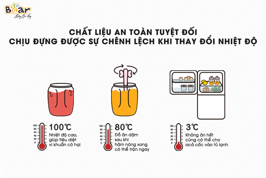 Thân máy xay được làm từ nhựa ABS chịu nhiệt cao; lưỡi dao 3 tầng sắc bén, cứng cáp, bền bỉ được làm từ inox 304 không gỉ; cốc xay được làm từ thủy tinh borosilicat vừa có khả năng chịu nhiệt nóng lên tới 100 độ C, vừa có thể chịu nhiệt lạnh khi cho vào ngăn đá để bảo quản thức ăn. Như vậy, chất liệu của cốc xay Bear chịu được sự chênh lệch khi thay đổi nhiệt độ và giữ cho thực phẩm không bị biến đổi chất. Do đó, mẹ bé có thể hoàn toàn yên tâm sử dụng máy xay 3 cối Bear – Máy xay 3 cối thủy tinh đa năng.